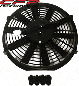 12 -inch high-performance universal electric radiator cooling fan. The fan is a 10-piece flat blade type. The motor is reversible and the fan is 12 Volt 2074 RPM and 1800 CFM. Four point mounting bracket kit. The high torque motor features sealed ball bearings and fully balanced blades which insure low noise levels and a long life of smooth operation.
