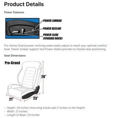These NEW Pro-series Pro-Grand Power seats from TMI are just what you are looking for! Pro Series Seats all-metal frame allows you to tilt or slide your seat. Tilting frames allow you to completely recline your seat, an option that was not always available in classic cars. Frames are wrapped with a heavy bolstered, high-density foam. No re-upholstering required, no hunting down old frames!